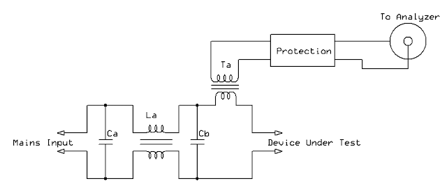 In the case of these LED floodlights, the only connection that they had to the rest of the universe was via their power connections, so it was clearly via its power leads that they were radiating their "grunge". To determine in some quantitative way how noisy this device was, a simple test fixture was constructed to measure the energy imparted on the mains power lead, represented schematically in Figure 2, below: